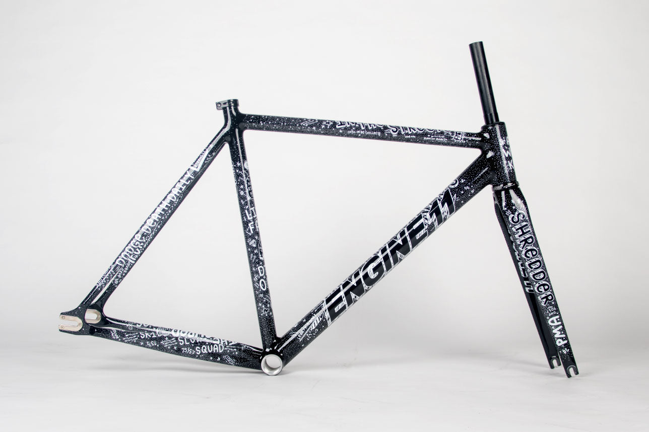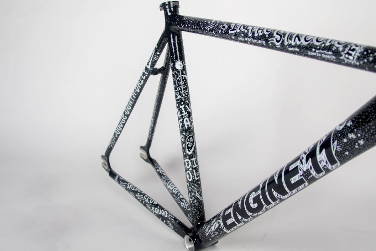 This collaborative frameset represents a convergence of track racing engineering and contemporary art. Engine 11's Crit-D platform, purpose-built for criterium competition, pairs with bespoke hand-illustrated graphics by Chas Christian, a respected figure in fixed gear culture known for both competitive prowess and artistic innovation.